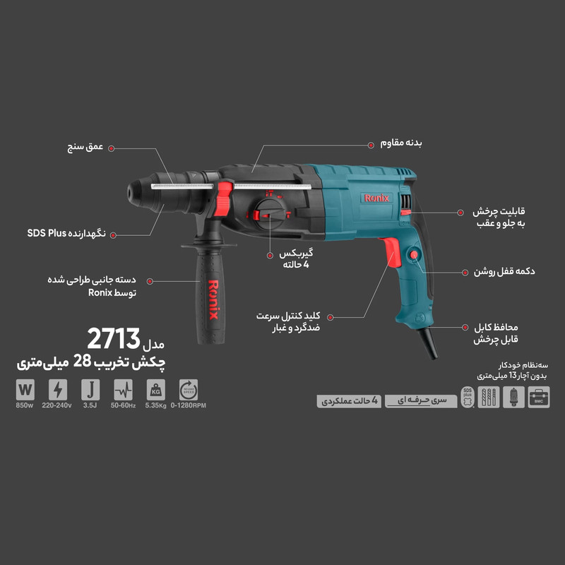 بلاخره پس از مدت ها شرکت رونیکس یک مدل دریل بتن کن با سه نظام تعویض شو به بازار ارایه داد.یکی از بارزترین ویژگی های این دریل بتن کن داشتن سه نظام اضافه با قابلیت تعویض شدن است .این دستکاه از موتور قدرتمند 850 واتی بهره می برد.سرعت گردش در حالت آزاد این دستگاه از 0-1280 دور در دقیقه می باشد.تعداد ضرذبه چکش در این دستگاه 5500 ضربه در دقیقه می باشد .