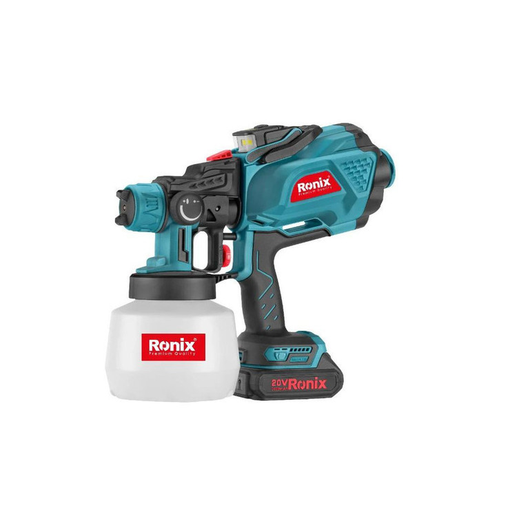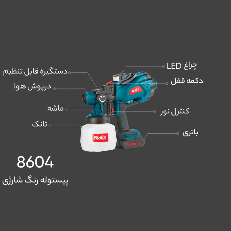 پیستوله رنگپاش شارژی 8604 رونیکس، نسل جدید پیستولههایی است که با مکانیزم حجم بالا- فشار پایین HVLP کار میکند. در این مکانیزم، حجم رنگ زیاد بوده و فشار هوا کم است. بنابراین، ذرات رنگی بیشتری روی سطوح مینشیند و در نتیجه، ضخامت رنگ بیشتر میشود. میتوان با تنظیم نازل از این پیستوله برای رنگکاری و پاشش حرفهای رنگ در جهات مختلف افقی، عمودی و گرد استفاده کرد. یکی از مهمترین مزایای این پیستوله، شارژی بودن آن است؛ چراکه بدون نیاز به سیم، در مکانهای با دسترسی دشوار و برای پاشش رنگ در سطوح وسیع قابل استفاده است. در پیستوله 8604 رونیکس از باتری 20 ولت لیتیوم-یون با ظرفیت 2000 میلیآمپر ساعت استفاده شده است. این باتری در تمام محصولات All In One سری 86 رونیکس قابل استفاده است؛ بین 18 تا 20 دقیقه کار میکند و حداکثر جریان رنگ 600 میلیلیتر در دقیقه را ایجاد میکند.