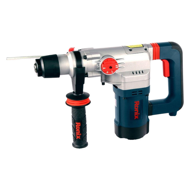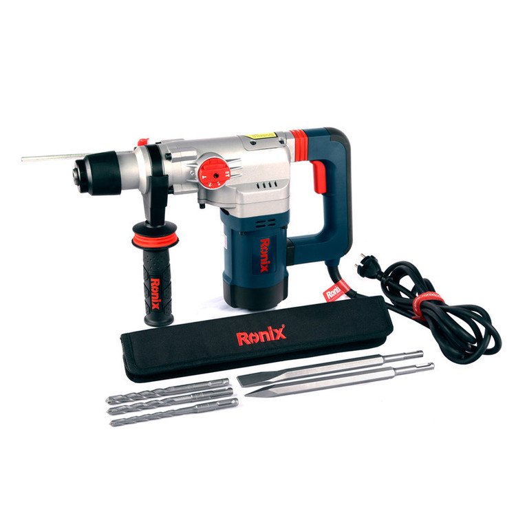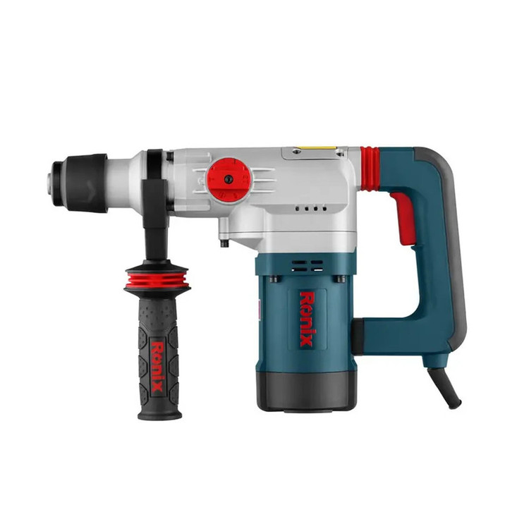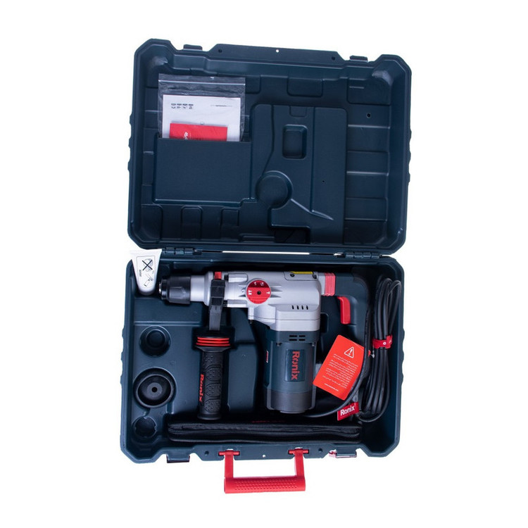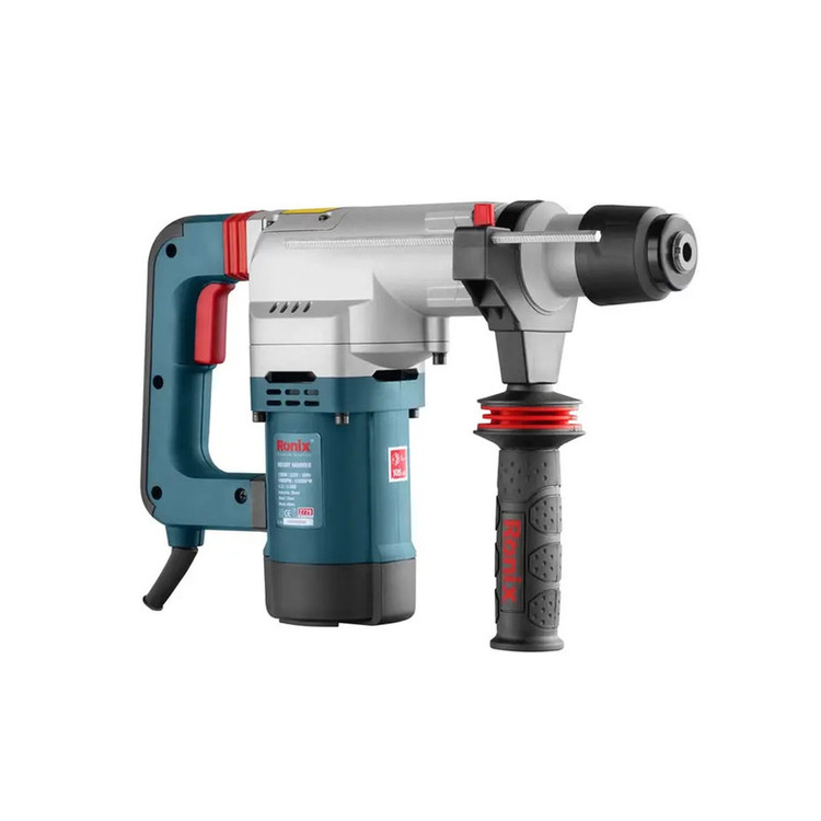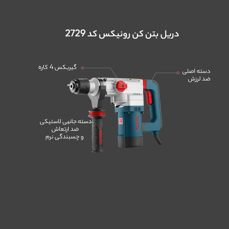 چنانچه به دنبال دریل بتن کن هستید، میتوانید محصولات شرکت «Ronix» «رونیکس» را بررسی و یک مورد را با اطمینان خاطر انتخاب کنید. و اما محصول پیش روی شما یکی از دریل بتن کن های ساخت رونیکس است که تحت عنوان مدل 2729 به بازار عرضه شده است. منبع تغذیه این ابزار برق بوده، ولتاژ آن 220 ولت و دارای ابزارگیر چهار شیار SDS Plus است. وزن این ابزار 4.6 کیلوگرم است. سرعت گردش آزاد این محصول 1000 دور بر دقیقه بوده، نرخ ضربه آن 4300 ضربه در دقیقه و توان آن 1200 وات است. حداکثر قطر سوراخکاری در مصالح این محصول 29 میلیمتر است و توان ضربه آن 4.6 ژول میباشد. این دستگاه به هنگام کار نیروی بسیار مطلوبی در کلاس وزنی خود را دارا میباشد و دارای استاندارد ISO 9001: 2008 بوده و از عملکرد بسیار خوبی برخوردار است. این دستگاه از متربال درجه 1 تحت استانداردهای روز اروپا تولید و به بازار عرضه گردیده است. اقلام همراه این دریل بتن کن عبارتند از: کیف BMC با کیفیت، دفترچه راهنما و کارت گارانتی، سه عدد مته و دو عدد قلم به همراه کیف مخصوص، دسته جانبی، میله عمق سنج، درپوش غبارگیر و گریس.