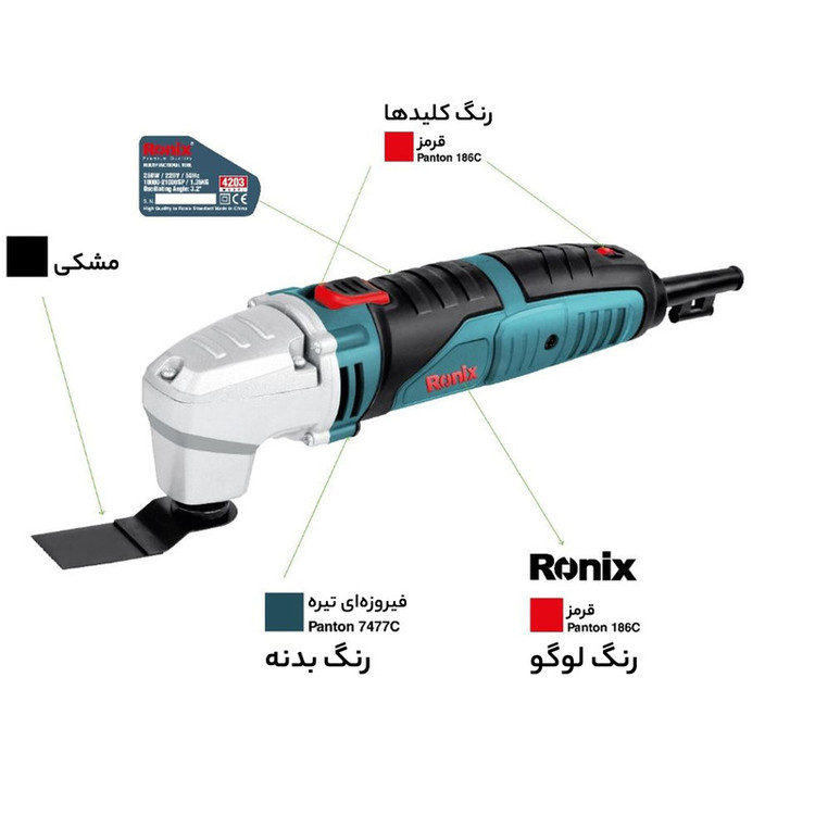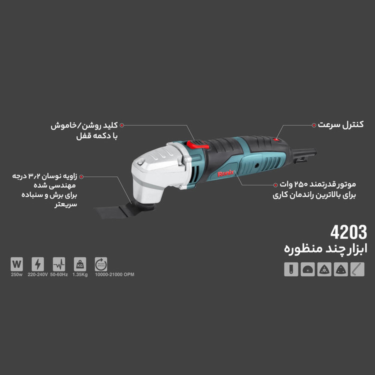 فرز همه کاره آچاری Ronix مدل 4203 مجهز به موتور قدرتمند 250 وات است که توانایی ایجاد حداکثر سرعت 21000 دور در دقیقه را دارد. این دستگاه قابلیت انجام عملیات برشکاری، سنبادهزنی، خراشیدن و تمیزکاری را با سرعت مناسب فراهم میکند. سرعت این دستگاه در بازه 10000 تا 21000 دور در دقیقه به کمک دیمر توسط کاربر برای انجام کارهای مختلف قابل تنظیم است. این دستگاه در زاویه حرکت 2،3 درجهای برای ایجاد برشهای دقیق و سریع و کاهش لرزش قابل تنظیم است. بدنه باریک با روکش لاستیکی نرم، امکان استفاده طولانی مدت را برای کاربر فراهم میکند. این فرز دارای رابط استاندارد به منظور نصب انواع متعلقات و مناسب انواع متریال مثل چوب، کاشی و PVC و …. است.