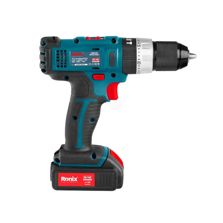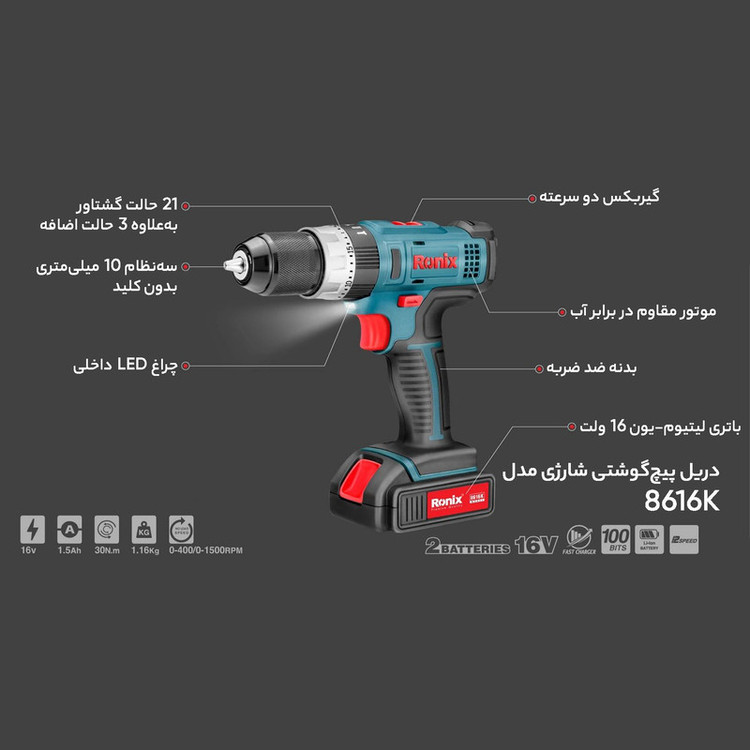 دریل پیچگوشتی شارژی «رونیکس» (Ronix) مدل «8616K» با یک باتری لیتیومی کار میکند. این باتری با ولتاژ 16 ولت، انرژی موردنیاز موتور دستگاه را تامین کرده است. موتور این دستگاه به یک گیربکس دووضعیتی مجهز است و در هر وضعیت بازهی سرعت گردش موتور تغییر میکند. در حالت اول، سرعت گردش بین 0-400 دوربردقیقه و در وضعیت دوم، سرعت گردش موتور بین 0-1500 دوربردقیقه متغیر است. سرعت پایینتر مناسب پیچگوشتی و دریلکاری سبک است؛ درحالیکه سرعت بالاتر بهمنظور دریلکاری با سرعت بالا استفاده میشود. گشتاور موتور این محصول در 18حالت مختلف قابلتنظیم است و در بیشترین مقدار به 30 نیوتنمتر میرسد. با کمک قابلیت تنظیم گشتاور میتوانید میزان نیروی وارده به سهنظام را تغییر دهید. سهنظام این دریل 10 میلیمتری، از نوع خودکار است. سیستم گردش چپگرد و راستگرد برای این محصول باعث میشود در حالت پیچگوشتی، بهراحتی پیچها را باز و بسته کنید و در حالت دریل، ورود و خروج مته را با سهولت بیشتری انجام دهید. ظرفیت باتری این دستگاه 1.5 آمپرساعت است. برای افزایش طولعمر باتری، شارژر دستگاه را به سیستم قطع هوشمند مجهز کردهاند. زیر سهنظام دستگاه یک LED تعبیه شده است. این لامپ LED در هنگام کار روشن میشود و محل موردنظر را بهخوبی روشن میکند. به همراه این دستگاه، لوازم جانبی قابلتوجهی عرضه میشود. حدود 100 قطعه از انواع مته و سری پیچگوشتی در جعبهی این محصول و در کنار دستگاه در اختیار خریدار قرار میگیرد. وجود این لوازم باعث میشوند کارایی دستگاه و سرعتعمل کاربر افزایش یابد. امروزه دریلها و پیچگوشتیهای برقی و شارژی کاربرد بسیار زیادی در صنعت، کارگاهها و حتی منازل دارند. تفاوت اصلی این دو محصول در سرعت گردش آزاد آنهاست. طی چند سال اخیر شرکتها برای پاسخ به نیاز کاربران، این دو محصول را باهم ترکیب کردهاند. شما با کمک این ابزار میتوانید از ویژگی دریل و پیچگوشتی بهطور همزمان بهرهمند شوید. شرکت رونیکس سالهاست که در زمینهی عرضهی ابزارآلات دستی و برقی فعالیت میکند. این شرکت علاوه بر حفظ کیفیت محصولاتش، آنها را با قیمتی مناسب روانهی بازار میکند.
