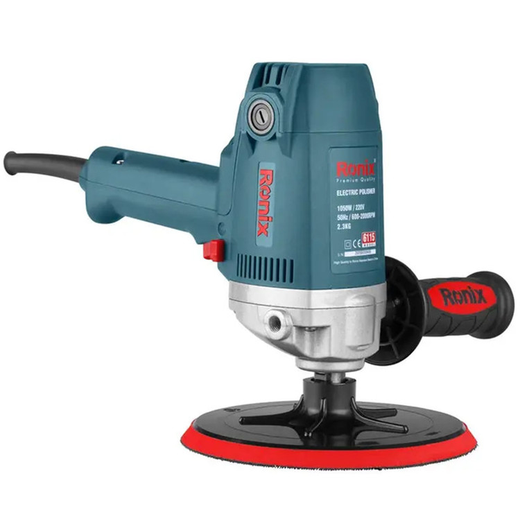 پولیش دیمردار رونیکس مدل 6115 پولیش دیمر دار رونیکس مدل 6115 توسط برق کار می کند و دارای توان 1050 واتی است. این دستگاه دارای قابلیت تنظیم سرعت در 6 حالت می باشد. اندازه قطر صفحه این مدل پولیش، 180 میلی متر است. دستگاه معرفی شده دارای گیربکس صنعتی و بلبرینگ های ضد غبار می باشد. داشتن این ویژگی ها باعث افزایش عمر دستگاه و افزایش عملکرد آن می شود. پولیش دیمر دار تفنگی رونیکس دارای دسته کمکی بوده که این ویژگی باعث تسلط کاربر و کاهش خستگی او می شود. به وسیله دستگاه پولیش می توان انواع سطوح را با سرعت و قدرت زیاد پولیش کاری کرد.