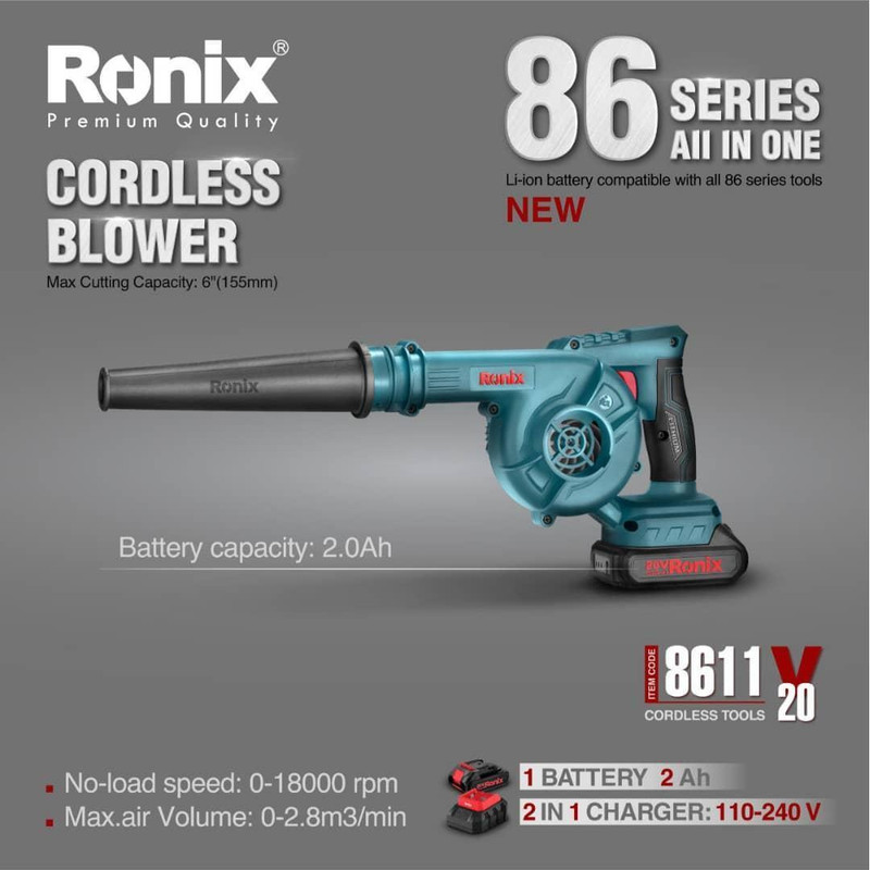 از بلوور یا دمنده و مکنده 8611 رونیکس، برای تمیزکردن سطوح مختلف استفاده میشود. پاکسازی داخل خودرو، حیاط خانه، کارگاههای نجاری، قطعات کامپیوتری و ... از مهمترین کاربردهای مهم این بلوورها هستند. معمولا در این فضاها کاربر دسترسی به برق مستقیم ندارد و استفاده از ابزار شارژی بهترین راه حل برای این مسئله است.