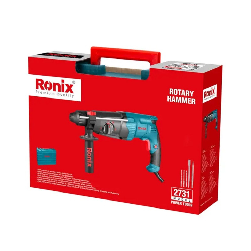 تنکن 30 میلیمتری 900 وات رونیکس مدل 2731، با موتور قدرتمند 900 واتی و توان ضربهای 3,3 ژول، ابزاری مناسب برای سوراخکاری و تخریب بتن، آجر و سایر مصالح ساختمانی سخت است. این بتن کن دارای چهار عملکرد متنوع شامل سوراخکاری، سوراخکاری چکشی، تخریب و چرخش معکوس (خلاصکن) است. سیستم ابزارگیر این دستگاه از نوع چهارشیار (SDS-plus) با قفلکن اتوماتیک است که امکان تعویض سریع و آسان مته را فراهم میکند. بدنه گیربکس از آلومینیوم دایکاست ساخته شده که ضمن افزایش دوام و کاهش وزن دستگاه، به کاهش دمای دستگاه نیز کمک میکند. از دیگر ویژگیهای کاربردی این بتنکن، سیستم پیشرفته کلاچ ایمنی آن است که از آسیبدیدن کاربر و دستگاه در برابر گیرکردن مته جلوگیری میکند.