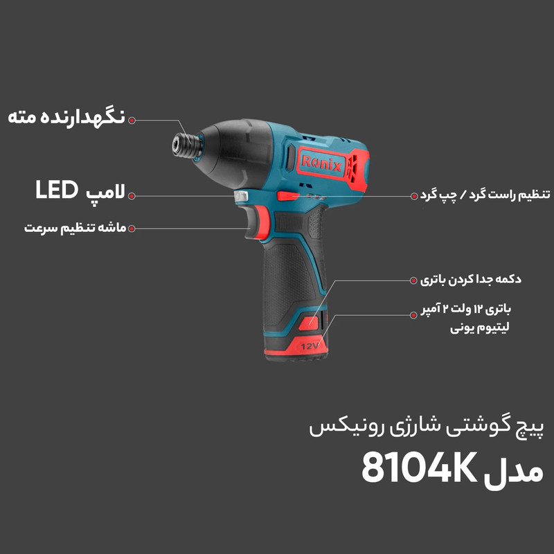 کیت دریل پیچگوشتی چکشی و شارژی8104kرونیکس دارای دو عددباتری 20ولت با ظرفیت 2 آمپر ساعت, کیف BMC, یک عدد شارژر فست شارژر سریع از یک موتور DC 12 ولت باقدرت وراندمان بالا بهره برده است. این موتور سرعتی بالغ بر 2200 دوردر دقیقه تولید می کند که به سه نظام آن منتقل شده وسری پیچ گوشتی هایی تا قطر 1.4 اینچ را به گردش در می آورد. موتوری که گشتاور فوق العاده 120 نیوتن متری را برای این ابزار پرکاربرد به وجود آورده و امکان پیچ کاری در سطوح چوبی و فلزی را برای آن میسر کرده است به علاوه این محصول دارای قابلیت پیچ کاری چکشی نیز هست که برای باز کردن پیچ های قدیمی و خورده شده و بستن پیچ در سطوح متراکم کاربرد دارد. دارای موتوری با کارایی بالا که منبع تغذیه این محصول شارژی یک باتری لیتیوم-یون 12 ولتی با ظرفیت 2 آمپرساعت است. به این معنی که باتری مورد نظر در مدت یک ساعت 2 آمپر جریان الکتریکی برای موتور تامین کرده و انرژی مورد نیاز آن برای حرکت را به وجود می آورد. خود باتری با یک فست شارژر باکیفیت در مدت زمان 50 الی 60 دقیقه از صفر تا صد شارژ می شود و به همین وسیله سرعت فعالیت کاربر را افزایش می دهد. بدنه دارای طراحی منحصربفردی با روکشی از جنس رابر باکیفیت و مقاوم در برابر انواع ضربات احتمالی و سقوط از دست کاربر است که علاوه بر این ضدتعریق و ضدلغزش نیز بوده و از لرزش دستگاه در دست کاربر جلوگیری می کند این بدنه بسیار سبک با حدود 1.64 کیلوگرم وزن، کوچک و با استحکامی فوق العاده است که باعث خستگی کاربر نشده و امکان استفاده در ساعت های طولانی و پرفشار را برای کاربر به وجود می آورد. تنظیم سرعت این پیچ گوشتی توسط یک کلید گازی انجام می گیرد. با فشار انگشت بر کلید گازی اصلی، ابزارگیر دستگاه شروع به حرکت می کند و با دکمه چپگرد و راستگرد جهت حرکت آن مشخص می شود. تمامی کلیدهای تعبیه شده بر بدنه 8104K از نوع کلیدهای ضدغبار باکیفیتی است که با جلوگیری از ورود گردوغبار به داخل دستگاه از استهلاک قطعات داخلی آن جلوگیری می کند و در نتیجه موجب افزایش طول عمر مفید محصول می شود.یک چراغ LED پرنور زیر ابزارگیر محصول تعبیه شده است که نقطه پیچ کاری را در محیط های تاریک روشن می کند تا فعالیت کاربر به دقت انجام گیرد.این دستگاه مجهز به چراغ نشانگر میزان شارژ باتری است.