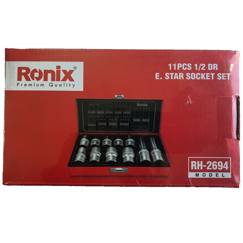 جعبه بکس 11 پارچه Ronix مدل RH-2694 از کروم وانادیوم ساخته شده که علاوه بر مقاومت بالا قابلیت ایجاد گشتاورهای بالا را ایجاد میکند. همچنین بکسهای این مجموعه دارای سوکت عاجدار با پرداخت سطح مات میباشند. این جعبه دارای سایزهای مختلف و بسیار کاربردی است که برای انجام فعالیتهای مختلف کاربرد دارد. تمام این مجموعه در کیف فلزی محکم و مقاوم نگهداری میشود که برای حمل بسیار آسان است. این بکس ستارهای برای باز و بسته کردن گل پیچهای ستارهای طراحی شده است.این مجموعه حاوی 11 عدد بکی ستاره ایی با درایو 1/2 می باشد .این مجموعه حاوی 9 عدد بکس کوتاه به شماره های E8,E10,E12,E14,E16,E16,E18,E20,E22,E24 و دو عدد بکس بلند یه شماره های E12,E14 می باشد . این مجموعه ساخت کشور تایوان می باشد .