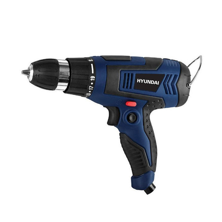 اگر قصد تهیهی ابزاری کارآمد برای سوراخکاری و باز و بسته کردن پیچهای مختلف را دارید، محصول فوق انتخابی مناسب خواهد بود. این دستگاه به شکلی مستقیم به برق شهری متصل میشود و نیازی به باتری ندارد. این دریل پیچگوشتی توانی برابر 230 وات داشته و نیاز شما به یک دریل و مجموعهای از چندین پیچگوشتی را پاسخ خواهد داد. سرعت گردش این دستگاه بین بازهی 700-0 دور بر دقیقه قرار دارد و کاربر قادر است با تغییر نیروی انگشت خود روی کلید دستگاه این سرعت را تنظیم کند. این دستگاه قابلیت گردش به سمت چپ و راست را داشته و میزان گشتاور آن در 19 حالت مختلف قابل تنظیم است. از دیگر مزایای این دستگاه میتوان به سهنظام خودکار آن اشاره کرد. این سهنظام از نوع 10 میلیمتری بوده و برای تعویض مته و سری پیچگوشتی، شما را از هرگونه آچاری بینیاز خواهد کرد. دستهی این محصول از خاصیت ضد لغزش برخوردار بوده و کمک زیادی به کاربر میکند. این محصول توسط شرکت «هیوندای» (Hyundai) تولید میشود و از کیفیت ساخت مناسبی برخوردار است.