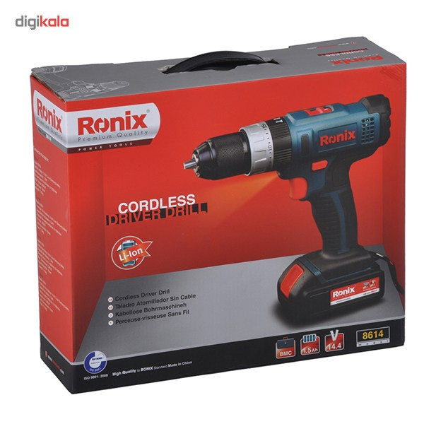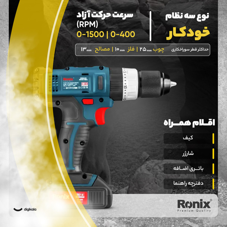 دریل پیچگوشتی شارژی «رونیکس» (Ronix) مدل «8614» با یک باتری لیتیومی کار میکند. این باتری با ولتاژ 14.4 ولت انرژی مورد نیاز موتور دستگاه را تامین کرده است. موتور این دستگاه به یک گیربکس دو وضعیتی مجهز است و در هر وضعیت بازه سرعت گردش موتور تغییر میکند. در حالت اول سرعت گردش بین 0-400 دوربردقیقه و در وضعیت 2 سرعت گردش موتور بین 0-1500 دوربردقیقه متغیر است. سرعت پایینتر مناسب پیچگوشتی و دریل کاری سبک بوده درحالیکه سرعت بالاتر بهمنظور دریل کاری با سرعت بالا مورداستفاده قرار میگیرد. گشتاور موتور این محصول در 21 حالت مختلف قابل تنظیم بوده و در بیشترین مقدار به 30 نیوتنمتر میرسد. با کمک قابلیت تنظیم گشتاور میتوانید میزان نیروی وارده به سهنظام را تغییر دهید. سهنظام این دریل 10 میلیمتری، از نوع خودکار است. سیستم گردش چپگرد و راستگرد برای این محصول باعث میشود در حالت پیچگوشتی، بهراحتی پیچها را باز و بسته کنید و در حالت دریل، ورود و خروج مته را با سهولت بیشتری انجام دهید. ظرفیت باتری این دستگاه 1.5 آمپرساعت است. برای افزایش طول عمر باتری، شارژر دستگاه را به سیستم قطع هوشمند مجهز کردهاند است. زیر سهنظام دستگاه یک LED تعبیه شده است. این لامپ LED در هنگام کار روشن میشود و محل موردنظر را بهخوبی روشن میکند. امروزه دریلها و پیچگوشتیهای برقی و شارژی کاربرد بسیار زیادی در صنعت، کارگاهها و حتی منازل دارند. تفاوت اصلی این دو محصول در سرعت گردش آزاد آنها است. در طی چند سال اخیر شرکتها برای پاسخ به نیاز کاربران این دو محصول را باهم ترکیب کردهاند. شما با کمک این ابزار میتوانید از ویژگی دریل و پیچگوشتی بهطور همزمان بهرهمند شوید. شرکت رونیکس سالها است که درزمینهی عرضهی ابزارآلات دستی و برقی فعالیت میکند. این شرکت علاوه بر حفظ کیفیت محصولاتش، آنها را باقیمتی مناسب روانهی بازار میکند.