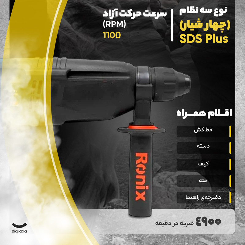 شرکت رونیکس Ronix با ارائه چندین مدل دریل بتن کن در کلاس ها و وزن های مختلف، انتخاب یک دریل بتن کن مناسب را برای مشتریان راحت تر کرده است. دستگاه پیش روی شما که جزو سبک ترین مدل های بتن کن و مناسب کارهای نصب در پروژه های ساختمانی میباشد مدل 2701 رونیکس است و با وزن 2.6 کیلوگرم و ابعاد 38 × 21 × 8 سانتیمتر، یک دریل بتن کن ضربهای با قدرت 800 وات است. سرعت این دریل در حالت بی باری تا 1100 دور بر دقیقه میرسد و دارای قابلیت کنترل سرعت است. این دستگاه هم برای مصارف خانگی و هم برای استفاده در کارگاههای ساختمانی و صنعتی بسیار مناسب است. این دریل توانایی سوراخکاری در چوب، فلز و بتون را دارد و حداکثر قطر سوراخ در این دستگاه در چوب، فلز و مصالح، به ترتیب 30، 13 و 26 میلیمتر است و برای تعویض مته نیازی به آچار ندارد و با ضامن موجود در گلویی دستگاه به سادگی انجام پذیر است. بتن کن 2701 از متریال درجه 1 و تحت استانداردهای روز اروپا توسط شرکت خوش نام رونیکس ساخته و به بازار ارائه گردیده است. از دیگر مزایای این دستگاه کلید چپ گرد راستگرد آن است که در انتهای دستگاه به گونه ای تعبیه گردیده که به سهولت از دو طرف دستگاه قابل تغییر است. .علاوه بر این، برخلاف مدلهای دیگر که کلید چپگرد راستگرد آنها روی شاسی دستگاه نصب شده است از مقاومت بالایی برخوردار است.