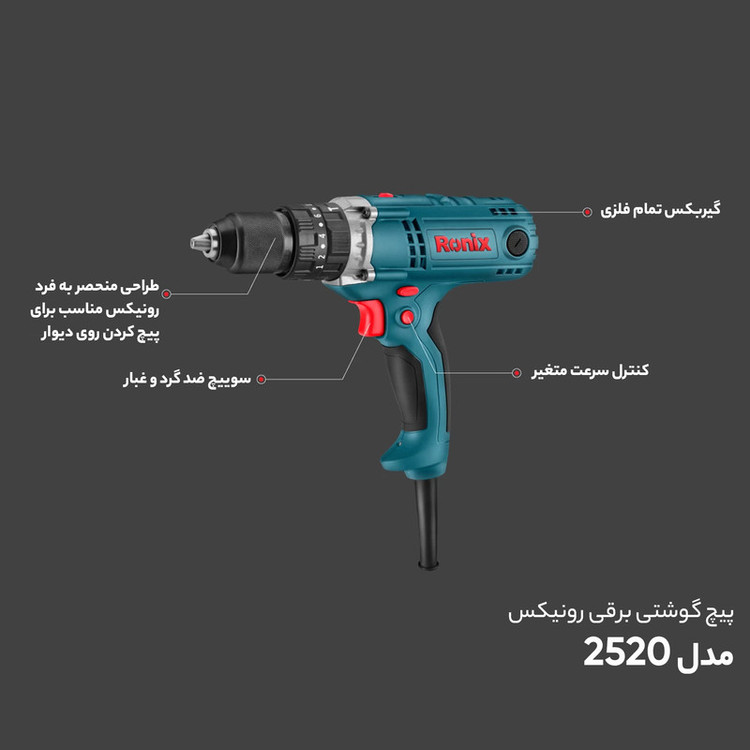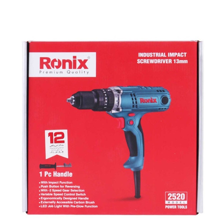 پیچگوشتی برقی رونیکس مدل 2520 یک پیگوشتی 3 حالته می باشدسه حالت آن عبارت است از چرخش چکشی ,چرخش و پیچگوشتی برقی .از این مدل میتوان به عنوان پیچگوشتی برقی و دریل استفاده کرد . این مدل دارای موتور قدرتمند 450 واتی می باشد که برای بستن پیچ های محکم می توان استفاده کرد . این پیچگوشتی برقی به همراه یک دسته جانبی ارایه می شود .از دیگر ویژگی های این دستگاه می توان به دو حالته بودن آن اشاره نمود .